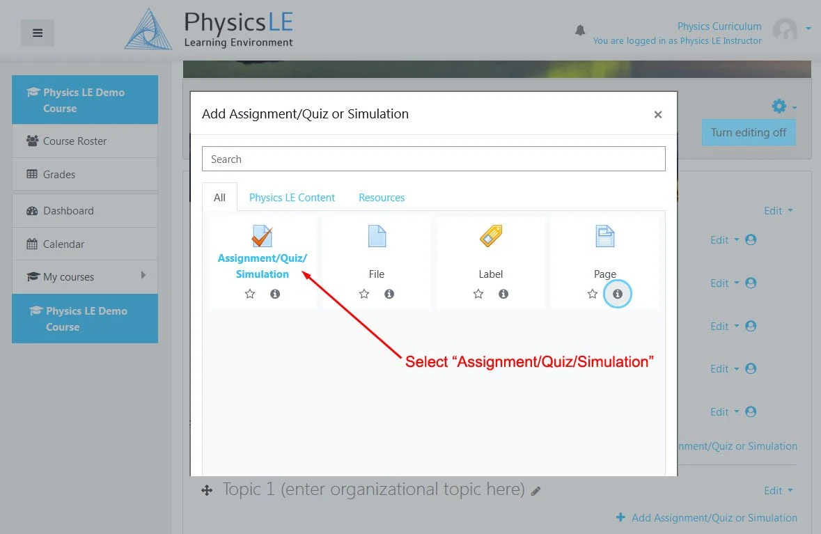 4) In the pop-up window, select Assignment/Quiz/Simulation. (Note that you can choose to add other resources to your Course page.)