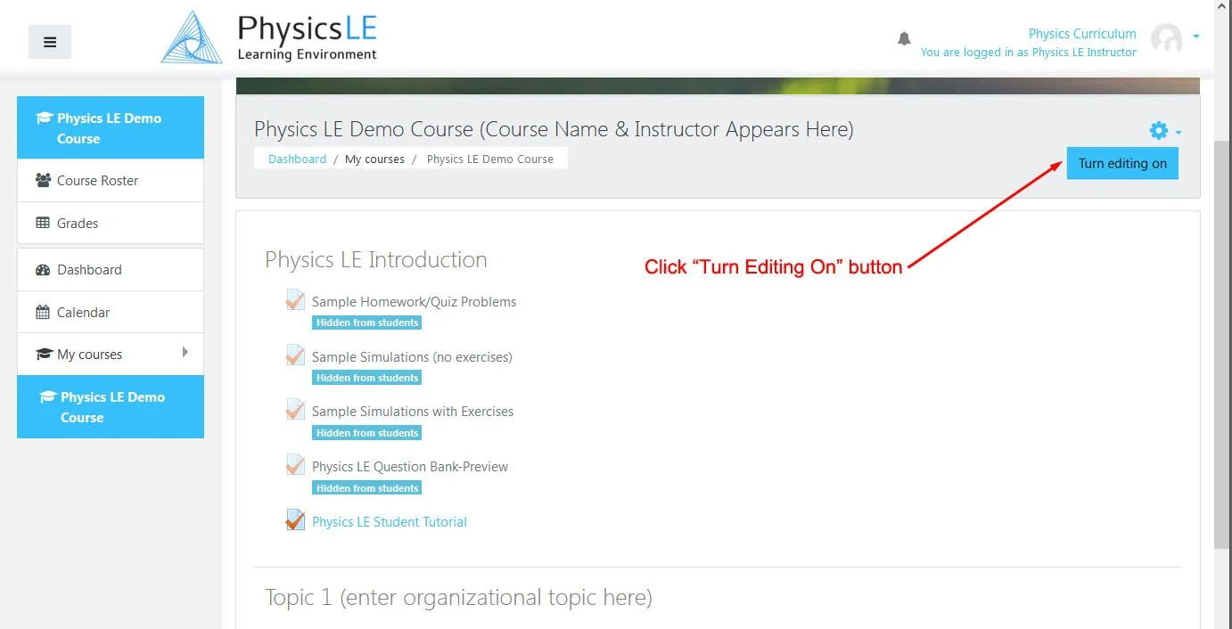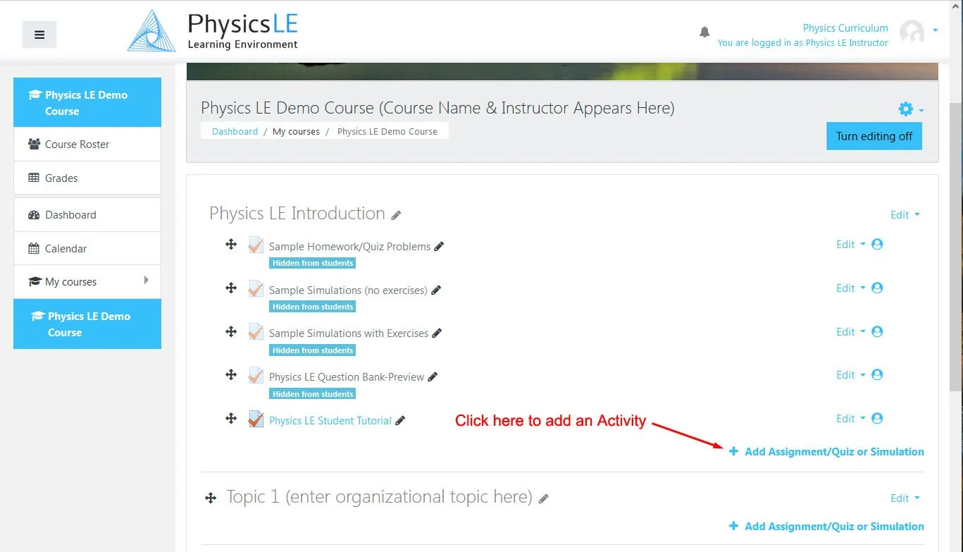 1) Navigate to your Physics LE Course page by clicking your course name in the left-side navigation menu.
